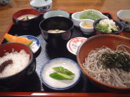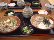 おお!観光地っぽい と失礼だが感心してしまいました(笑)。で、駐車場はどこにしようかなと走っていると各お店のおばちゃんやおじちゃんが盛んに手を振って客寄せ(笑)。 結局、三回通りかかって「おねいさんがいる所がいい」と決定。でも、3回目はおねいさんがいなかったので頑張って手を振ってくれたおばちゃんがいるお店の駐車場に停めました。3回も通ったのはなんだったのだ・・・藁 で、話を聞くと駐車料金は無料だがお土産を1000円分買ってくださいとのこと。商売上手だね・・・ 腹が減ったのでまづは食事。「おいしいお蕎麦、すぐ出来ますよ」と声をかけられたので即、お店決定。オイラとひらめさんは「永平寺そば」、カナヲは「そば定食」をオーダー。