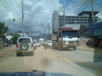 (左)近所の道。舗装道なのだが、乾いた泥で白く見える。奥の建物が避難場所になった学校。 (右)近所の幹線道路。復旧車両と復旧作業で大渋滞中。