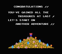 このあと、彼はどうやってあんな洞窟の奥からこの財宝を持って帰ったのでしょうか? 今の疲労度97%のオイラといい勝負かもしれません。今のオイラなら自分の身長と同じ高さから落ちたら死ぬ自信が50%あります(笑)。 あ〜、あと、この画面は6周目をクリアしたところです。だから何だって気もしますが(藁) |