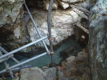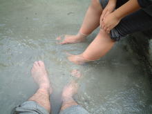 足湯中♪ 戻りのトロッコ電車の時間が近づいて来たので、そろそろ戻ろうか?と思っていたらカナヲが岩風呂を発見。すると「はいりたーい」とカナヲの温泉スキルが発動。カナヲは水着を持ってきていたので隣にあった脱衣所で着替えて岩風呂堪能決定〜。 仕方ないのでオイラは、カナヲが入っている岩風呂の入り口で門番していたら一組のカップルがやってくるではないですか?。で、女性の方が岩風呂を覗き込むとそのおねーちゃんも「岩風呂はいりたーい」の温泉スキルが発動。何やら秘湯ガイドブックで見たこの岩風呂に入る為に、今回黒部に来たようで。 そんなわけでおねーさんも着替えて こんなに周りに人がいるのに、そしてこんなキレイなおねーさんがまぢですか?って感じ。オイラ、こっ恥ずかしくてあんまり見れなかったよ。てゆーか、オイラ以上にカナヲがビキニおねーさんと温泉入れて「大満足」だったようですが(笑)。 そんなカナヲが大満足の岩風呂、疑問なのはビキニおねーさんの連れの男性。なぜか、温泉入っている時、ビキニおねーさんの写真を執拗に撮っていましたが かなり謎なカップルでした・・・