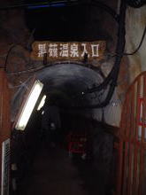 左:岩風呂の案内が書かれた岩 右:岩風呂の中はこんな感じ。岩っていうより洞窟な感じ で、次は路線を戻って「黒薙」(くろなぎ)という温泉に行くことに。トロッコ電車に乗るとまたもや同じ車両にさっきの6人グループが(笑) しかも黒薙に到着するとここで降りるのはオイラとカナヲ、その6人グループだけという何たる偶然か(笑)。駅のおっちゃんに「黒薙温泉行くの?」と聞かれて(つ〜か、他に行けるところないっぽい山奥ですが)オイラ達は日帰り、6人組はどうやら泊まりらしい。 すると、「いつもの道が通れないんでこっちから行って」と案内されたのは あの〜、まぢですか?(笑)。しかも線路が引いてあるんですが・・・。歩いていてトロッコ電車来たらどうすんじゃい!と思ったが、カナヲに聞くと先週の黒薙温泉の帰り道もこのトンネルから戻ってきたらしい。 それなら安心と気分はスタンドバイミー。トンネルを進んでいくと黒薙温泉の入り口をはけーん。今度はせまい急勾配の道を延々と下っていくではないですか。気分はもうスペランカーですよ。