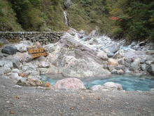 そんなこんなで8号線を爆走し、無事に宇奈月温泉郷に到着。すぐさま、トロッコ電車の切符を買いに行くと終点の欅平(けやきだいら)では帰りの電車が3時間待ちだとか。 良くワカンネェのでカナヲにお任せで最初は鐘釣(かねつり)というまで行くことに。車両はもちろん窓ナシの普通車、便は12時9分発の2号車。一緒な車両に乗った6人グループ(男3、女3)との奇妙な出会いはこのときから始まりました。 鐘釣までは片道約1時間。大自然の中をゴトゴトと走るトロッコ電車。かなーり気持ちいいのだが、トンネルや日陰になると風が寒いかも・・・。 そんな電車からの景色を眺めていると、カナヲが というではありませんか!。オイラも見たが時すでに遅し。富山と言えば、福井と同じくらいにクマが多発している地域。で、こんなに山奥であれば、そらクマもデフォで生息しているわな〜。くそう、オイラもクマー!!見たかったぞ。クマー! で、あっという間に1時間が経過し鐘釣に到着。すると、前の座席に座っていた6人グループもここで降りるようで。何やら意気揚々とやる気漫々な雰囲気。どうやら行き先は同じ温泉が湧いている河原っぽい。 河原に着いてみると、話に聞いたとおり、ごく自然に温泉が湧き出ていて天然の露天風呂があるではないですか!しかーし、今日は団体客が多くこんな人の多い所で入ると 多くの公衆の面前でフル○ンで入れるか?と自問自答していると、さっきの6人グループの男3人はためらうことなく服を脱ぎ、まさかとは思ったが本当にフ○チンで露天風呂にダイブ!! まぁ、ただ単に女の子の前でハイになっていただけかもしらんが・・・。何にしても読売やらタビックスやらの団体客が河原に観光に来てもお構いなしで温泉入っていた彼ら。さすがにオイラは入れませんでしたよ。一人ではなぁ、そばに一緒にバカやってくれる同志がいたら入ったかもしれませんが・・笑 仕方ないのでしばらくは河原の温泉が湧き出ている箇所で足湯。もうこれが気持ち良いのなんのって。20〜30分はくつろいでましたねぇ。ああ、ここは天国だ。