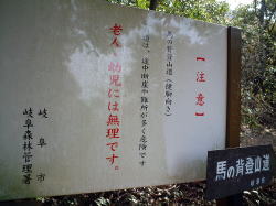![]() 登山道の起点である ![]() 馬の背登山道の起点。登山道としっかり明記 いや、あの道はハイキングじゃないよ。まぢ登山道です。すれ違う人はきちんとしたトレッキングシューズ履いて登山な格好しているしさ。オイラみたいな靴底がつるつるの革靴なんて誰もいないでやんの。でも、子供は元気に駆け上がっていた・・・。オイラの年金は君たちがガッツリ働いて払ってくれると信じてるよ(爆) ![]() もー道っていうか崖じゃん ![]() 稲葉山城(岐阜城)もついにぎたにぃ軍により落城 そんなわけで、天下布武を号令し満足の一日でありました。それにしても疲れた、もち帰りはロープウェイですよ。ワシももうそんなに若くないのでね(笑) ![]() 秀吉の槍?それとも同姓同名なのか??? ![]() 信長様の刀。カブキすぎだろうよ、これw
