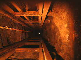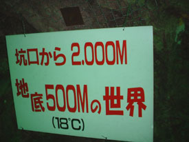 ![]() 左:受付の建物 右:地底に潜るとこんな看板が 入場券を購入し、マイクロバスで鉱山入口へ向かい一気に地底に潜ります。坂を一気に駆け下りる様はディズニーランドの某アトラクションのようですよ。 地底に潜ると気温は年中通して18度。夏場は涼しく冬は暖かいわけですな。見学コースには実際に使っていた重機や器具が展示してあります。