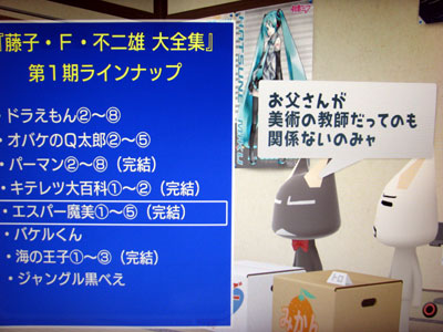 明日から福井でも「エヴァンゲリヲン新劇場版・破」が公開されます。約1ヶ月遅れですか。思ったよりは早かったかな?近いうちにまた見に行ってこようっと! そして朗報なのが「サマーウォーズ」が8月1日から福井でも公開されるらしい。遅れて公開されるのだったら金沢まで見に行こうと思っていたので、これは嬉しい。来週か、楽しみだなぁ。 ![]() もう亡くなられてから13年も経つのか ![]() どれも魅力的過ぎる、欲しい! ![]() やっぱりクロとは気が合うな(笑) 以前からチェックしていた藤子・F・不二雄 大全集がいよいよ発売です。さすがに全巻予約してまとめ買いする財力はないので毎月ごとの購入です。でも、福井では1日遅れて明日発売です。早く読みたいぜ! 中でも楽しみなのはエスパー魔美ですね。幼心にドキドキしながらTVアニメを見ていたものです(苦笑)。いやー、漫画っていいものですね! |