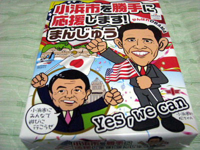 今日は久々に夏らしい天気でした。まぁ、暑すぎるのもどーかと思うが・・・苦笑。そんな訳で福井県の南のほうまで行って来ましたが、こんな商品が売っていたので買ってみた。![]() Yes,we can 右側の人物は福井県小浜市の市長さんです。そして左は現在の総理大臣。来月には総理ではない可能性が高い方なので、最後の記念として購入しました。これ来月になったら鳩ぽっぽさんに変わるのかな?つーか、現在も麻生さんの許可は取ってあるのかも分かりませんけどね(苦笑) |