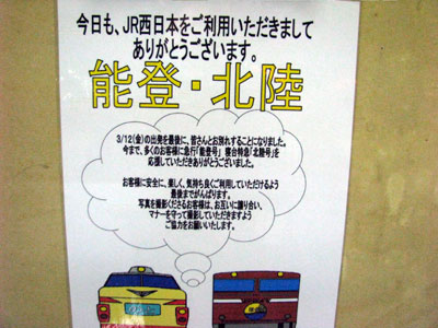 先週の土曜日、仕事を終えてから金沢駅に行って来ました。目的は来月廃止になる急行「能登」と寝台特急「北陸」の駅撮りです。 21時ちょうどに金沢駅に着いたのですが、ホームには既に50人以上の方がカメラを構えてスタンバイしていました。能登と北陸が入線する時間が近づくにつれ段々と人は増え、最終的には150〜200人ほどは居たのではないでしょうか?まだ、ラストランまで1ヶ月もあるのに・・・苦笑 そんなオイラも撮影をしたのですが、あんまりいい写真が撮れませんでした。ダメだ、これは平日に行かないと厳しいなぁと思いました。まだ日にちはあるのでガンバロウッと! ![]() 能登と北陸 ![]() ホームにはこんな案内も ![]() ホームの床にもご丁寧に・・・苦笑 |