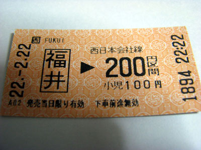 ![]() 平成22年2月22日22時22分に購入した200円の切符 今日は2並びの日。福井県内のJR主要駅でも140円の記念入場券を発売したのですが、仕事帰りに行ったJR鯖江駅とJR福井駅では完売していました。まぁ、売り残っている訳ねぇわなー。 仕方ないので入場券を券売機で買って帰るかなと思いましたが、せっかくなら切符に印字される時間も合わせようかと!ネタに生きるオイラなのです。 22時過ぎに福井駅に行って、券売機の前でウロウロしていました。最初は誰も居なかったのですが、徐々に人が増えてきて結果的には30人ほどの人が集まりましたよ。同じことを考える人はいるんだなぁ・・・笑 券売機の時間が2分ほどズレていて皆でワイワイいいながら切符を買っていたのですが、意外と楽しかった。たった200円でちょとの幸せと人々との交流。たまにはこんなイベントもいいわねぇ・・・苦笑 |