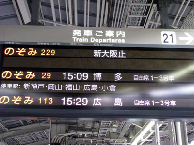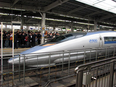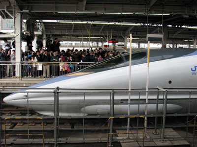 今日は朝も早くから大阪へ行って来ました。目的は500系新幹線のぞみ号のラストラン撮影の為です。米原駅ホームにての流し撮りや京都駅ホームでの撮影とも考えたのですが、停車時間が3分と長いことと0系新幹線ラストラン撮影の時の経験を生かせる場所と言うことで新大阪駅に決定しました。 まぁ、ついでに大阪まで行くのならと言う事でもう一つの目的も作って堪能してきたんですが、それは明日の戯言で(笑) 朝はセレブにサンダーバード2号で福井駅から終点大阪駅まで何故か指定席で乗車しました。朝っぱらから並ぶのかったるかったんだもんー。 大阪に着いたあとは難波、道頓堀、心斎橋とフラフラしたあと14時19分に新大阪新幹線ホームに入場しました。狙うは最後の500系新幹線のぞみ29号です。 結構遅めの入場だったので場所取りに苦労するかな?と心配していたのですがホームは思ったほど人が多くなかった。確かに500系車両自体が廃止になるわけでもないし、記念式典が行われる駅でもありませんからね。まぁ、比較的人が少なくて逆にラッキーだったかもしれません。 ただ、ここ最近の鉄道ファンのマナーの悪さを警戒してか、警備員は必要以上に配置されていたと思います。ちょと厳重すぎるかな?と言う気もしました。まぁ、安全の為だと思いますが切なくなるのも事実。マナーを守らない人が居る時点で仕方ないことなのかもしれませんけど・・・ そして、15時06分。のぞみ29号が入線。一斉にたかれるフラッシュの嵐。鳴り響くシャッター音とありがとうの声、そして警備員の怒号。何度経験しても凄まじい光景です(苦笑)。しかし、テンション上がり胸に熱い感動が込み上げて来ます。何故にこんなにも心を揺さぶられるんだろう(それはオイラが鉄だからです・・・笑) 何はともあれ無事にカメラに収め、心に焼き付けた500系のぞみの最後の勇姿。近未来的なフォルムと初の営業運転時速300キロの夢を与えてくれた500系。オイラの中では0系に継いで新幹線の中では好きな車両であることを再確認できた一日でした。 ![]() 東海道区間では500系は引退です ![]() やっぱりカッコいい ![]() ベストな停車位置 ![]() ちょーカッコいい! ![]() 500系バームクーヘン ![]() 裏には泣ける言葉が・・・ ![]() オマケ:太平洋側は色々と大変なようで |
