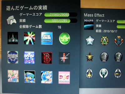 ![]() 祝!実績解除数1001 気が付くとxbox360での実績解除数が1000を超えていました。計算すると今までに遊んだゲームの7割以上は解除しているんですな。なかなかの数値じゃないですか? 実績って只の自己満足なポイントに過ぎませんが、ゲームの寿命を延ばすという意味では非常に有意義なシステムだと思います。xbox360のゲームは実績解除の為に何度も時間を掛けて遊ぶようになりましたし、色々な楽しみ方をすることも多くなりました。 中には解除が絶対ムリな実績もありますが、難しい解除条件であればあるほど解除できた時の達成感は何事にも変えがたいものがあります。 細々と頑張って今後もポコっと解除を続けていこうと思います。 |