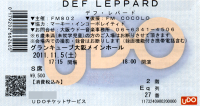 朝から大阪まで行って来ました。目的は「デフレパード」のライブです。まぁ、その前に一昨年亡くなった友人を偲んできたわけですけどね。早いもんだ、もうアレから2年も経つのか・・・ で、ライブですが今回は今年発売されたライブアルバムを引っさげての世界ツアー。と言うことでヒット曲のオンパレードでした。すげぇーよ、聞きたかった曲がほとんど聞けたよ。感謝感激雨あられですよ、レップスサイコーだぜ! ただ、会場となったグランキューブ大阪のメインホール。座席の間隔が他のホールと比べて狭い気がして、満足に腕も上げられない状態でした。それだけが不満だった、座席的にはかなり後ろだったけど良く見えたのに・・・ 今回のツアー、ノーカットで映像化されないかなぁ。イギリスでのライブでいいので(デフレパードはイギリス出身のバンドなんで)発売されないかな? ![]() S席だったけどかなり後ろでしたよ〜 |