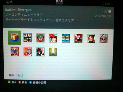![]() 頑張りました! xboxLiveアーケードで配信されている「レイディアントシルバーガン」の実績を全解除出来ました。同じトレジャーのゲームである「斑鳩」の実績がどうしても全解除できないので今回も難しいかな?と思っていましたがイケたよ。やったぜ、俺! ストーリーモードで全武器をMAXレベルまで上げる為に何度も遊んでいたら自然と巧くなっていたらしい。お陰さまでアーケードモードもノーコンティニューでクリアできた。まぁ、自機10機設定で100万点エブリ設定で残2機でしたけどね(ヘタレすぎる) まぁ、とにかく全解除できると気持ちがいいものです。さて、次のゲームを片付けるぞ! |