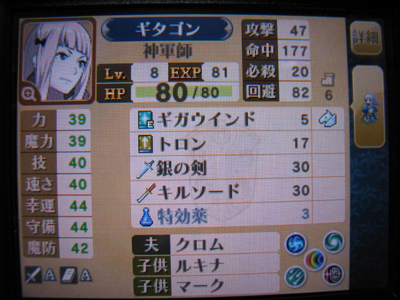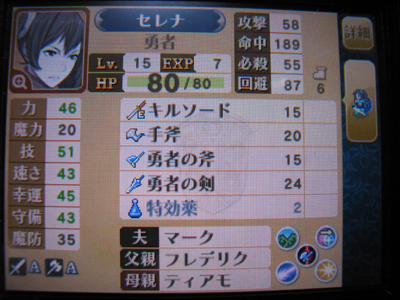 「ファイアーエムブレム覚醒」をようやくクリアしました。クリアまでの所要時間約75時間。これはゲーム内でカウントされた時間なのでリセットしてやり直した実プレイ時間などを合わせるとかるく80時間を超えていますね。遊びすぎだな・・・苦笑 追加DLCがあまり面白くないのでアレですけど、本編は面白かった。まぁ、今までのFEシリーズのように敵側にもストーリーがあるともっと良かったんだけどね。ま、概ね合格点を挙げることが出来る完成度でした。 で、二周目として難易度ルナティックで遊び始めたのですが最初から敵が強すぎて泣けてくる。序章はクリアしたけど第1章目がムリ。これはキツイなぁ・・・ そんな訳で路線を変更してノーマルかハードで始めて各キャラ同士の支援会話を埋めようかなぁと思います。どうやらマイユニットは子供世代とも結婚することが出来るらしい。やば!セレナたんのご褒美アニメ見たいぞ! てなわけで今度はマイユニットを男にして各女性キャラと結婚しまくってやろうかと思います。がんばろうー! ![]() フルパラメータ! ![]() 一番のお気に入りセレナたん |