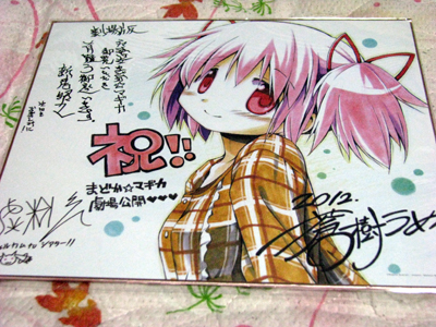 ![]() ![]() パンフレットと先着順の色紙 劇場版 魔法少女まどかマギカ[前編]始まりの物語を見てきました。ぶっちゃけた話、本当に総集編でしたな。でも、色々な部分に新規カットが追加されていたので間違い探しの様な気分で楽しめました。 あと、前編で思ったより話が進んだので普通に残りの話数を流しても120分には足りないんですよねぇ。そう考えると後編が楽しみで仕方ありません。うー。早く見たいぜ! |