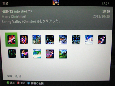 Xbox LIVE アーケードにて配信された「NiGHTS into Dreams...」を細々と遊んでいます。昔、このゲームが遊びたいが為に友人からセガサターン本体ごと売ってもらった記憶があります。いやー、懐かしい。彼は今、何をしているんだろうなぁ・・・ で、今回のリメイクはモチロンHD化されています。あの幻想的な世界がフルHDで蘇るだけでも嬉しいのに価格はたったの800ゲイツ。これにクリスマス・ナイツまで収録されていると言うのだから大盤振る舞いですよ。 早速遊んでみましたが、懐かしいと同時に下手くそすぎてビックリしました。ランクAがなかなか取れないんですけど(汗)。あー、コレはしばらくやりこまないとダメですね。まぁ、楽しいからいいか! |