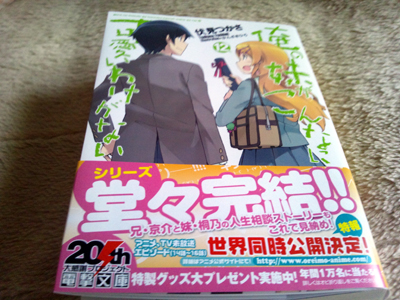 ![]() これで完結なんですよ! 「俺の妹がこんなに可愛いわけがない」の12巻ですよ。色々と衝撃的な展開でしたが、キレイに終わっていたので良しとしましょうかね。つーか、京介氏、マヂで漢(おとこ)だなぁ・・・。そりゃ惚れるわ(苦笑) 現在放送中のアニメも当初の予定より1話増えて全16話となるそうです。この原作のように最後まで行くのかな?だとしたら、あやせ回が非常に楽しみなんですけど。あぁ、早くアニメで見たいぜ! | |